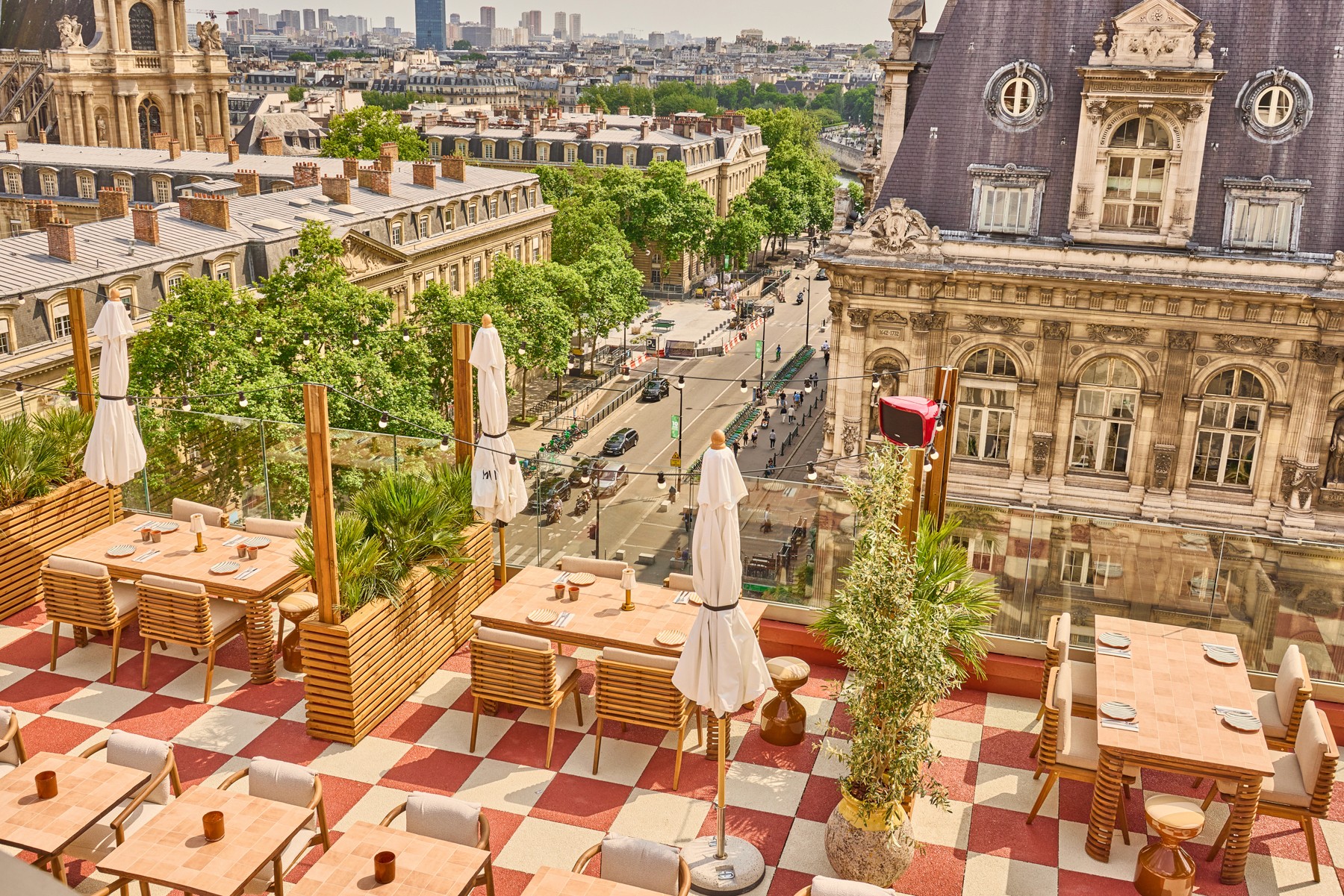Spacieuse et élégante, la Grande Terrasse du 6ᵉ étage offre un espace intérieur et extérieur avec une vue imprenable sur l’Hôtel de Ville.